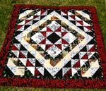 Diana from England has turned the Wakahuia pattern into a giant treasure box. She enlarged the blocks to 7½" to better show off the fabrics. The idea is that the 'boxes' fit on top of a single bed and the ordinary quares drop nearly to the floor on both sides and bottom of the bed. Diana also says that buying fabric while she is abroad gives her double pleasure, both buying it (no problem with breakages) and then deciding how to use it.