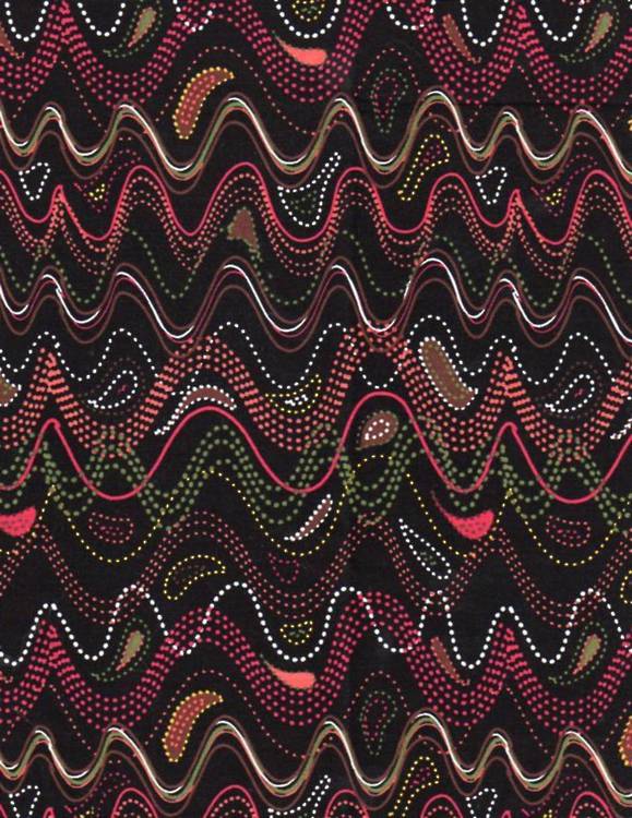 The bright pink/red, orange and green dots, with a touch of ochre, on a rich black background creates a wonderful moving pattern down the length of the fabric.