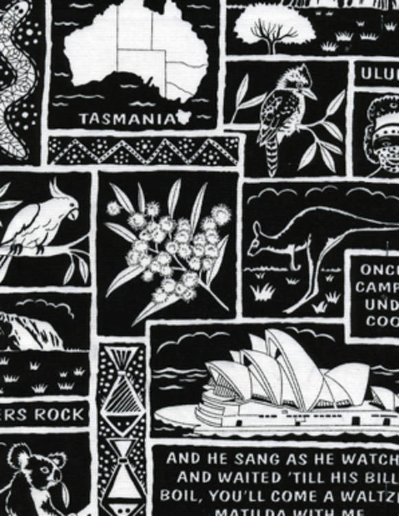 The design features a range of Austrlain images as well as text from Waltzing Matilda. Wonderful Australian icons, all beautifully illustrated in white on black, include a kangaroo, koala, platypus, Uluru, boomerangs, the Opera House and much more. Great for any black and white sewing or quilting project.